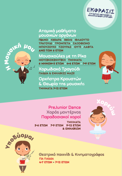κιθάρα μπουζούκι βιολί τρομπέτα φλάουτο σαξόφωνο Τραγούδι )Χορωδίας & Μουσικής Παιδείας (Μουσικούλες με τη Ρίκα) για παιδιά από 9 μηνών έως 9 ετών.