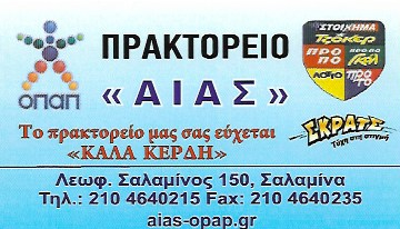 Βρίσκετε την επιχείρηση στο VresOnline αναζητώντας για: πρακτορείο οπαπ Σαλαμίνα, τυχερά παιχνίδια Σαλαμίνα, κίνο Σαλαμίνα, τζόκερ Σαλαμίνα, στοίχημα Σαλαμίνα