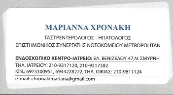 Η γαστρεντερολόγος Χρονάκη Μαριάννα προσφέρει υψηλού επιπέδου υπηρεσίες σε όλο το φάσμα της Γαστρεντερολογίας, στην διαγνωστική και επεμβατική ενδοσκόπηση: γαστροσκόπηση, κολονοσκόπηση, πολυποδεκτομή, ενδοσκοπική τοποθέτηση γαστροστομίας κτλ.